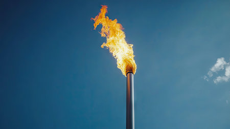 A striking image showcasing vibrant flames erupting from a tall steel pipe against a clear blue sky, illustrating the themes of energy, power, and industrial activity.