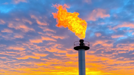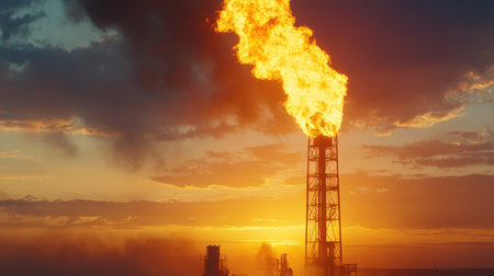 A striking image of a flare stack emitting vibrant flames and smoke against a sunset backdrop, highlighting industrial energy production and its environmental impacts.