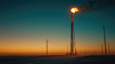 An industrial tower emits a flame into the darkening sky, illustrating the intersection of energy production and environmental issues at dusk.