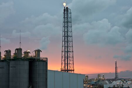 Industrial gas flare burning brightly at oil refinery during sunset energy production concept