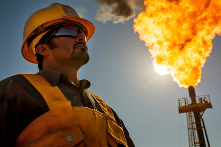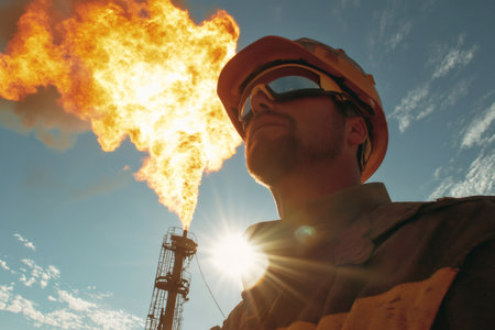 Oil and gas industry worker wearing safety gear, looking at a large flame from a flare stack against a blue sky