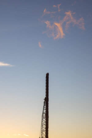 Towering industrial chimney billows fiery gas, filling the sky with thick smoke, a stark reminder of pollution. The steel structure emits dangerous toxins, impacting the air and environment