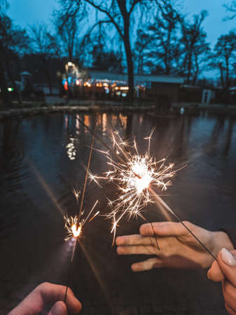 happy new year and merry christmas concept. female hand holding a burning sparkler bengal light. space for text. pyrotechnics concept, shining fire flame fireworks