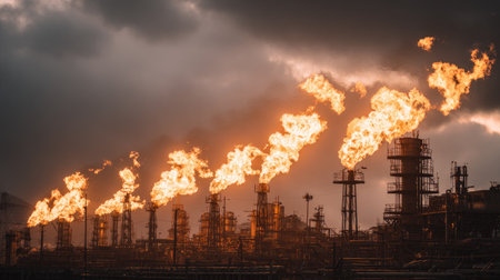 This striking image captures dramatic flames erupting from industrial refinery stacks, silhouetted against a moody, cloudy sky during dusk.