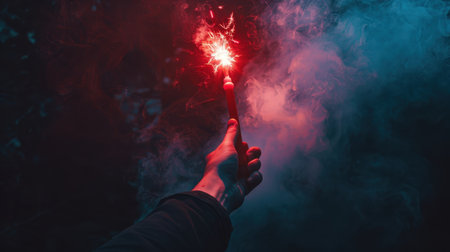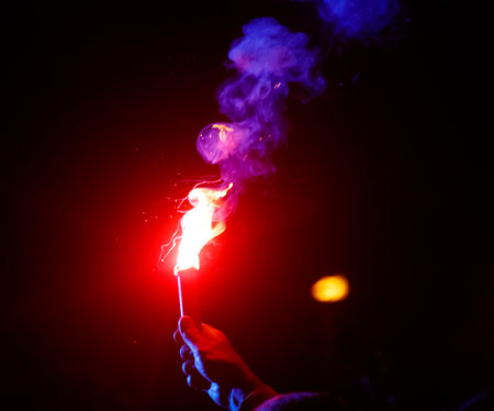 Man's hand holding a burning sparkler in the dark with red and blue smoke