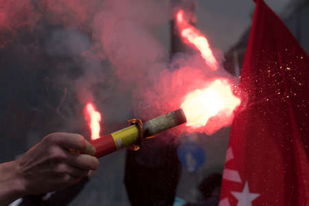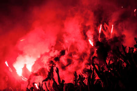 Football fans lit up the lights, flares and smoke bombs. Protest concept.