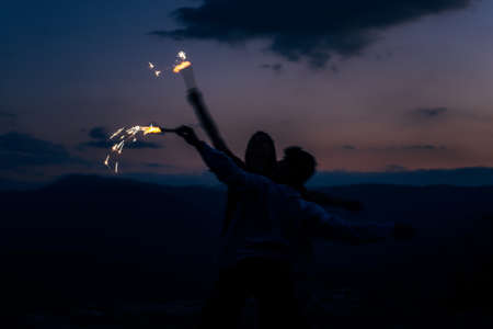 Friends enjoying in a mountain peak party and dancing with fire sparklers sticks