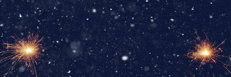 Sparklers on dark night sky. Bengal fire for christmas background with space for text. Horizontal
