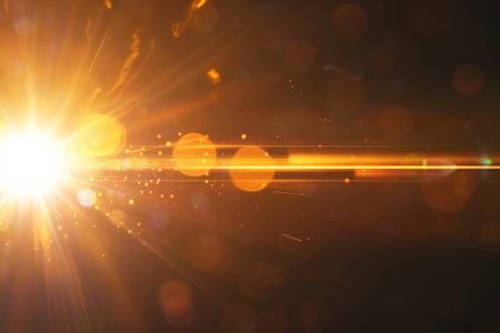 A diagonal golden light beam cuts across a dark gradient background, filled with sparkling particles and soft bokeh effects.