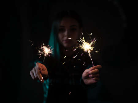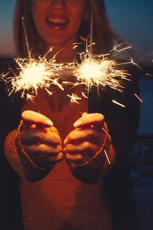 Close-up of happy woman with bright bruning sparklers in the night, warm color tone