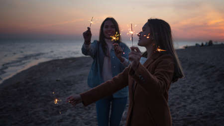 Two young women with sparklers in the open air. Friends having fun on the beach,