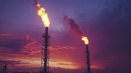 A captivating view of two industrial flame towers against a stunning sunset, showcasing the intersection of energy production and environmental impact.