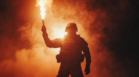 Silhouette of a soldier holding a flare in one hand, pointing in the dark, generative ai