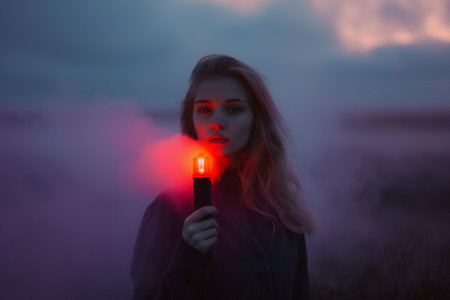 Young woman with red torch in her hand in a foggy field