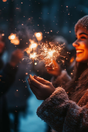 A young woman smiles brightly while holding a sparkler, surrounded by friends. The festive atmosphere is enhanced by falling snowflakes in a winter celebration.