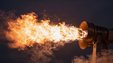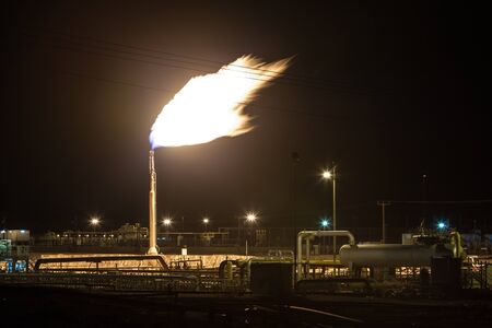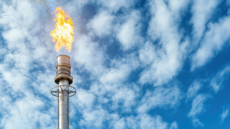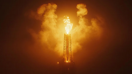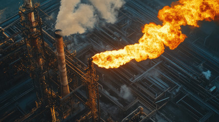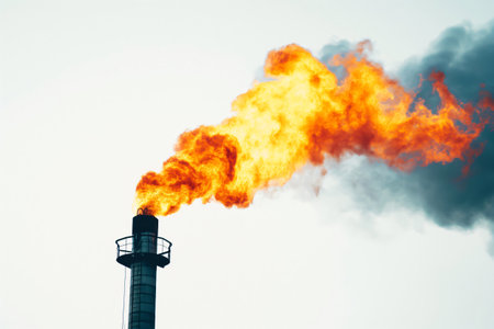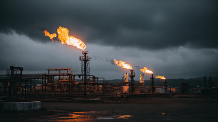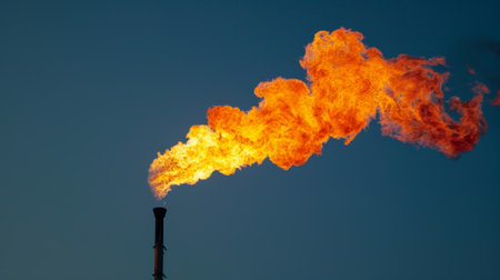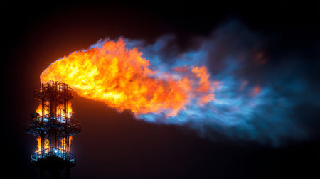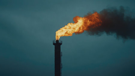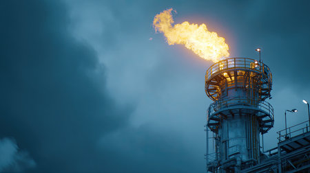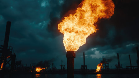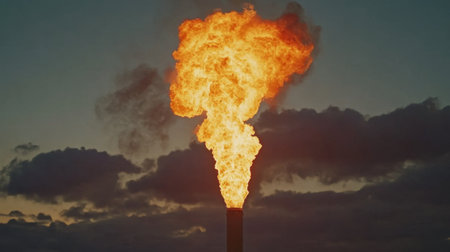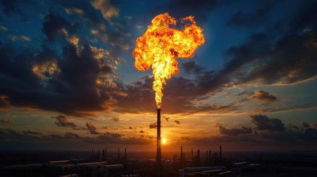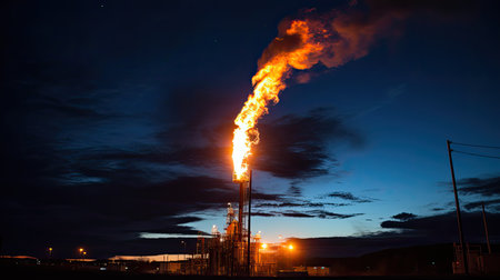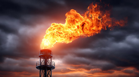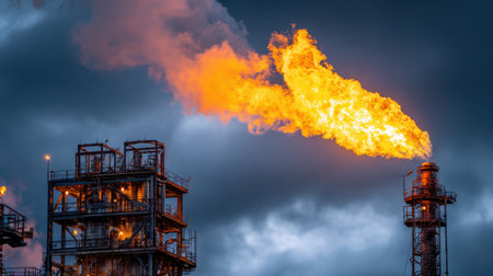 Dramatic view of a fiery gas flare at an industrial facility set against dark clouds. The intense flame symbolizes energy production and highlights environmental challenges.