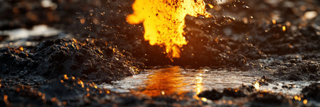 An intense oil gusher bursts from the ground, spraying liquid and flames upward, highlighting the raw power of natural resources.
