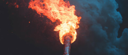 Large industrial chimney releasing a massive flame and thick smoke, polluting the environment
