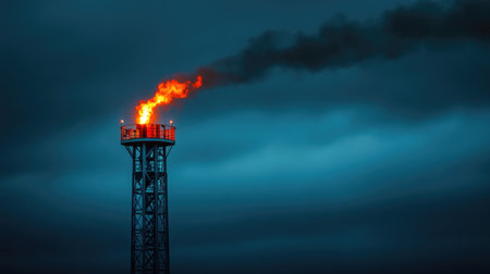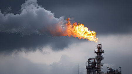 A striking image featuring a gas flare emitting bright flames against a backdrop of dramatic dark clouds. The industrial setting highlights energy production's impact on the environment.