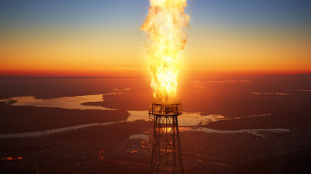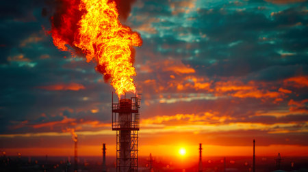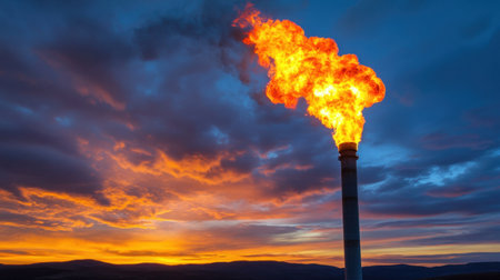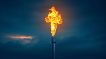A dramatic view of an industrial flare stack with a bright flame against a darkening sky, showcasing energy production and environmental challenges in the modern era.