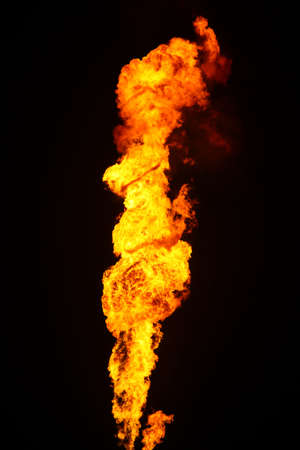 A striking image of a blazing flame erupting from a flare stack in a dark landscape, illuminated against a backdrop of a star-filled night sky.