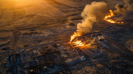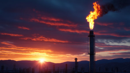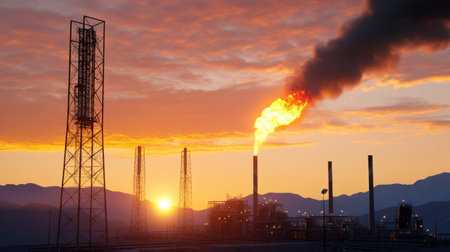 Industrial site at golden hour with fiery flare highlighting energy and climate conflict