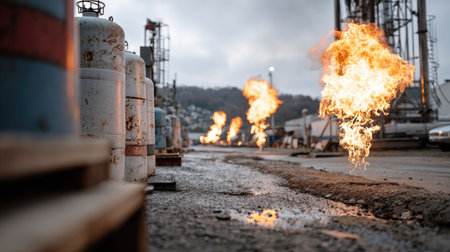 Dramatic scene of gas flares burning brightly alongside propane tanks at an industrial site, showcasing energy production and hazards against a cloudy sky.