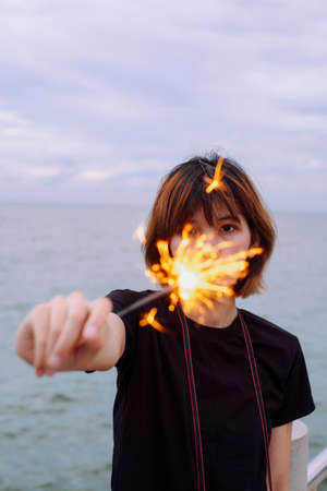 Portrait of young asian short hair woman holding playing with sparkler on the beach.
