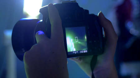 Digital single lens reflex camera in male hands. Photographer shooting hands close up. Man photographer makes photos. Male hands hold the camera close-up