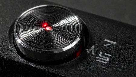 A macro view captures the precise moment of action. The illuminated red light on a sleek, metallic record button signals the start of a recording, capturing a story, or preserving a memory.