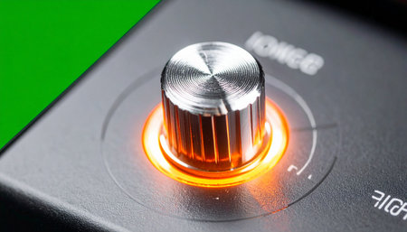 A close-up of a precision-engineered volume knob, glowing with warm orange light, indicating power and readiness.