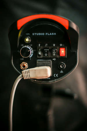 Photo studio strobe light equipment on a dark background. Photo equipment