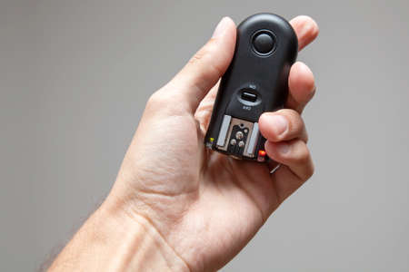 Male hand holding a wireless flash trigger