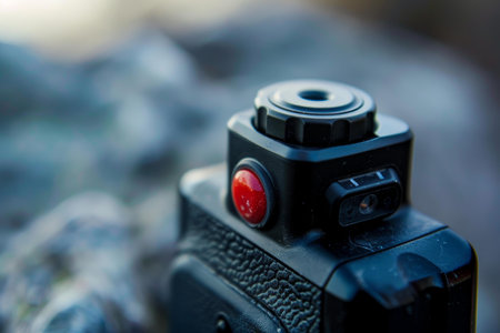 Red recording button on a black camera is being pushed, ready to capture video footage