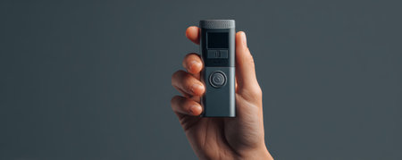 Handheld compact voice recorder held by person, portable digital audio device for recording speech and interviews with minimalist design