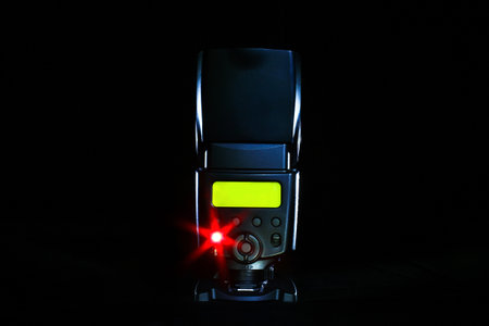 Kiev, Ukraine - January 29, 2022: On-camera flash of the Godox brand on a dark background.