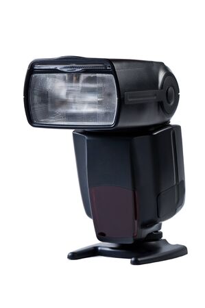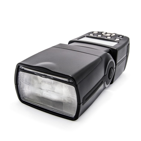 Close up of a camera flash. The flash is white and black. The flash is the main focus of the image