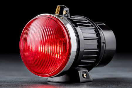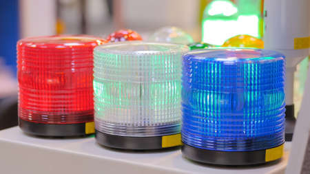 Close up of alarm lamp signal warning flashing light for industrial machinery at emergency, support and services exhibition. Danger, legal, alert light, attention, hazard, manufacturing concept