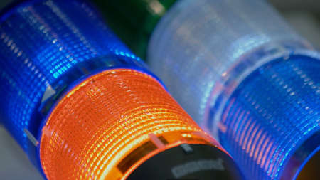 Close up of alarm lamp signal warning flashing light for industrial machinery at emergency, support and services exhibition. Danger, legal, alert light, attention, hazard, manufacturing concept