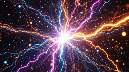 An abstract illustration shows energy bursts in a dark environment. Vibrant streaks of orange, blue, and purple emanate from a central point. The visual style features digital artistry with glowing effects. Suitable for designs requiring dynamic and visually impactful elements, also suitable for editorial or commercial purposes.