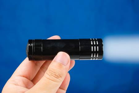 Close-up of person holding a flashlight emitting blue light in dark setting, dramatic lighting emphasizes the hand and beam.