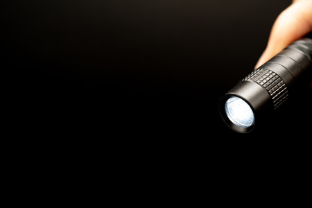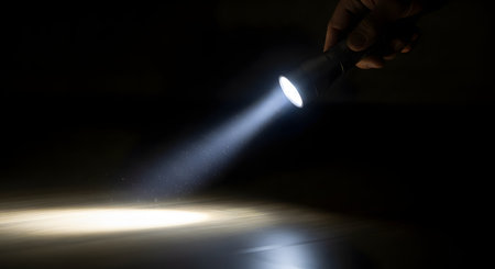 A close-up image of a bright flashlight casting a powerful beam of light into a dark space, highlighting its sleek design and functionality.