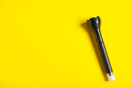 Police equipment. One flashlight on yellow background, top view. Space for text