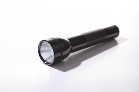 A high-quality black metal flashlight rests on a smooth white surface, showcasing its bright beam ideal for emergencies and outdoor adventures.