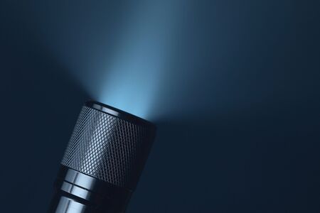 A close-up shot showcases a black flashlight emitting a beam of bright light against a dark blue gradient backdrop. The flashlight's design features intricate texture.