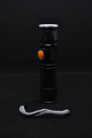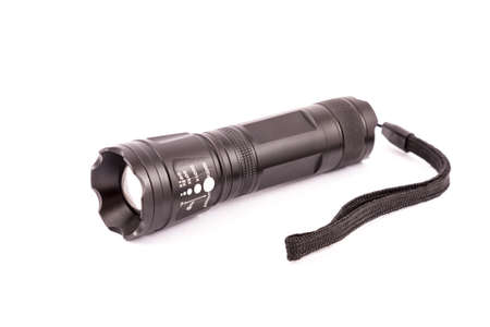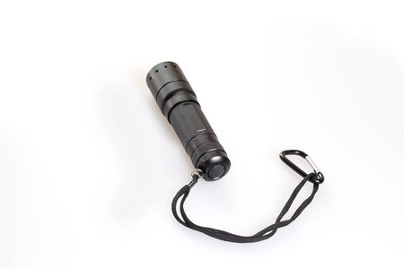 Close up of black aluminum metal flashlight for outdoor use with wrist strap on white background