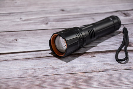 Flashlight stands on a table on a black background with copy space.