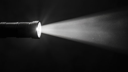 A striking black and white photograph capturing a flashlight emitting a bright beam of light. The image showcases the contrast of darkness with the narrow light, emphasizing the tool's functionality and design. Perfect for themes related to exploration and safety.