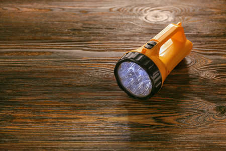 Modern flashlight on wooden background