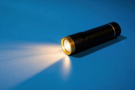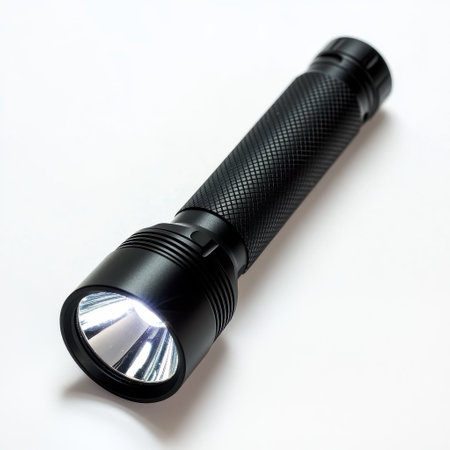A close-up image of a bright flashlight casting a powerful beam of light into a dark space, highlighting its sleek design and functionality.